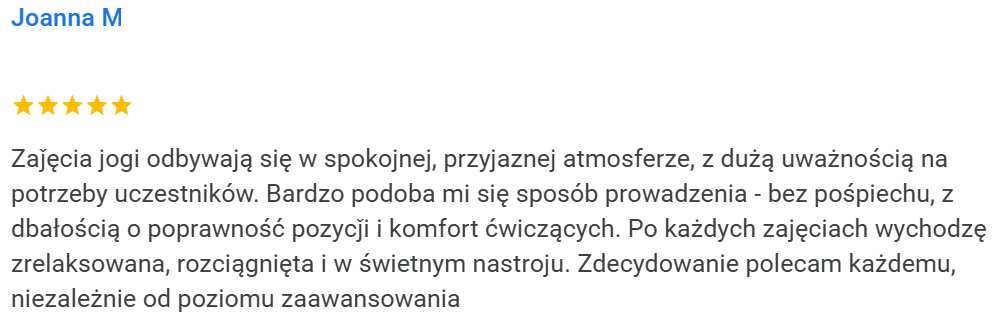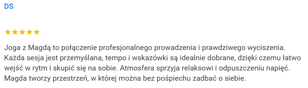 Swoją przygodę z jogą zaczęłam kilka lat temu w szkole jogi Katarzyny Szyńskiej, której wiedza i doświadczenie przyczyniły się do tego, że zechciałam zostać nauczycielem jogi. W maju 2025r. ukończyłam instruktorski kurs Hatha Jogi u prof. Szopy współtwórcy stowarzyszeń jogi w Polsce, a obecnie kończę również nauczycielski kurs jogi Yoga Alliance RYT-200. Zależy mi na rozwoju własnym, by móc dzielić się zdobytą wiedzą i doświadczeniem z innymi.